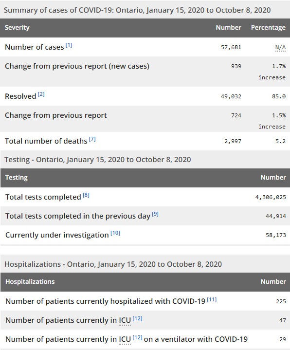 再看看安省方面的详细数据,截止10月8日,安省已对4,306,025例行了新冠病毒检测(检测数较昨天新增44,914),还有58,173处于被调查阶段。确诊总数57,681(较昨天新增797,确诊率上升为1.78%),包括49,032例康复(康复率下降为85%)、2,997例死亡,死亡率下降为5.2%。住院患者225例(增加19);进入ICU患者47例(未变);IU插呼吸机患者29例(未变)。