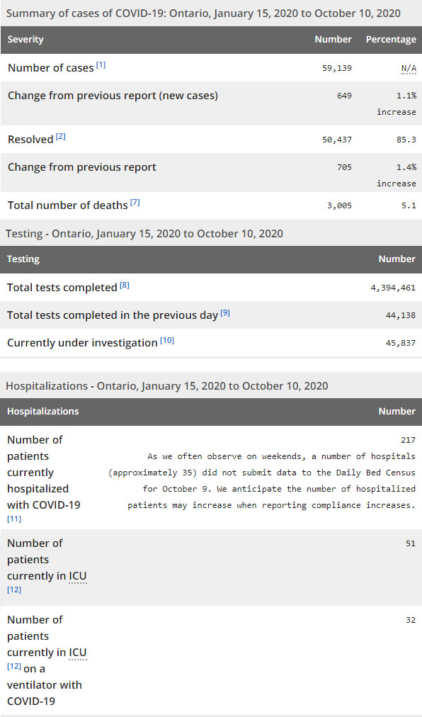 再看看安省方面的详细数据,截止10月10日,安省已对4,394,461例行了新冠病毒检测(检测数较昨天新增44,138),还有45,837处于被调查阶段。确诊总数59,139(较昨天新增649,确诊率下降为1.47%),包括50,437例康复(康复率上升为85.3%)、3,005例死亡,死亡率仍为5.1%。住院患者217例(新增4);进入ICU患者51例(增加3);IU插呼吸机患者32例(增加3)。