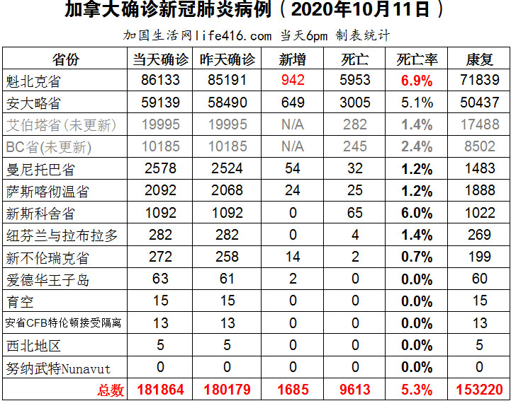 【加国生活网编译报道】截至10月11日下午6点,加拿大确诊新冠病例总数181864(当日新增1685),死亡9613。魁省确诊总数86133(当日新增942);安省确诊总数59139(当日新增649);艾省和BC省逢周末不更新。加拿大首席公共卫生官建议国民在感恩节表达感恩的最好方式是与圈子以外的任何人保持距离,以确保彼此之间的安全;加拿大公共卫生局目前还没有承认新冠传播途径包括气溶胶传播。加国生活网专门制作了如下统计数据表: