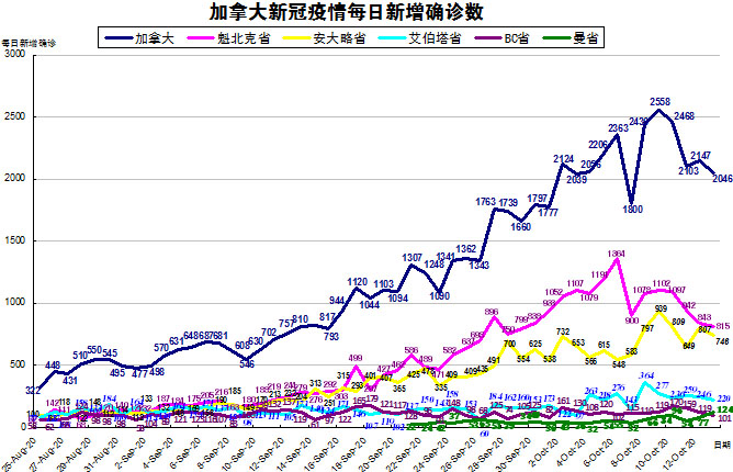 随着感恩节长周末的结束,一直没有数据更新艾省、BC省和安省终于提供新数据了,加国生活网小编将当天新增的4042例逐日进行了分解。由于加拿大目前的疫情格局已经不再是魁省和安省确诊病例最多的情况了,其他几个省份也渐渐开始加重起来,“第二波”疫情已经到来,所以加国生活网小编统计了从8月25日至10月13日的五个省份的新增确诊数,并制作了如下曲线图,大家可以了解一下加拿大目前新冠疫情的发展趋势。加拿大当日新增2046例,按新增确诊数按省份排列分别是:魁省新增815、安省新增746、艾省新增220、BC省新增101、曼省新增124。