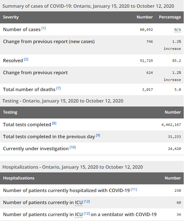 再看看安省方面的详细数据,截止10月12日,安省已对4,462,167例行了新冠病毒检测(检测数较昨天新增31,233),还有24,420处于被调查阶段。确诊总数60,692(较昨天新增746,确诊率上升为2.39%),包括51,729例康复(康复率上升为85.2%)、3017例死亡(死亡率下降为5.0%)。住院患者230例(增加13);进入ICU患者60例(增加9);IU插呼吸机患者34例(增加2)。
