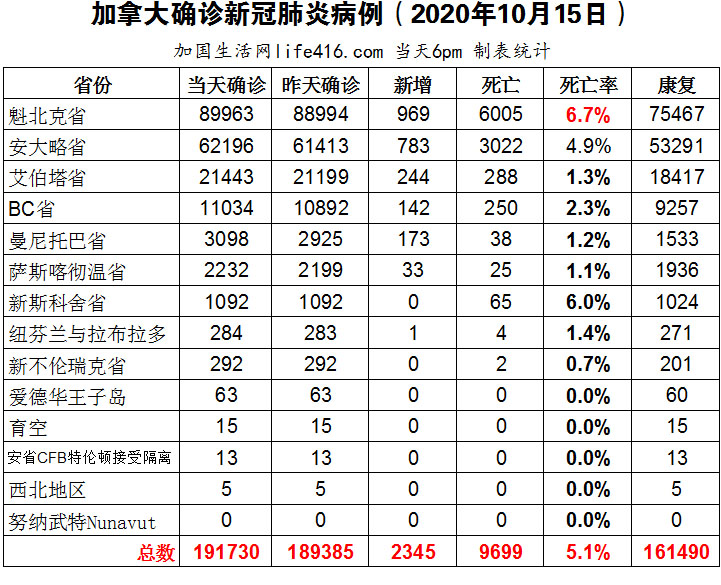 【加国生活网编译报道】截至10月15日下午6点,加拿大确诊新冠病例总数191730(当日新增2345),死亡9699。魁省确诊总数89963(当日新增969);安省确诊总数62196(当日新增783);艾省确诊总数21443(当日新增244);BC省确诊总数11034(当天新增142);曼省确诊总数3098(当天新增173)。BC省确诊首例与新冠有关的多例炎症综合征(MIS-C)病例;曼省连续第三天创自疫情以来最高值;安省约克区的新病例数量已超过渥太华;安省2021-2022年度赤字高涨,省府无可避免要加税或消减服务;研究显示O型血的人新冠感染率和住院率均最低。加国生活网专门制作了如下统计数据表: