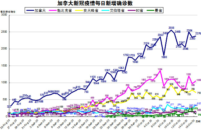 由于加拿大目前的疫情格局已经不再是魁省和安省确诊病例最多的情况了,其他几个省份也渐渐开始加重起来,“第二波”疫情已经到来,所以加国生活网小编统计了从8月25日至10月16日的五个省份的新增确诊数,并制作了如下曲线图,大家可以了解一下加拿大目前新冠疫情的发展趋势。加拿大当日新增2376例,按新增确诊数按省份排列分别是:魁省新增1055、安省新增712、艾省新增332、BC省新增155、曼省新增75。