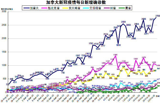 由于加拿大目前的疫情格局已经不再是魁省和安省确诊病例最多的情况了,其他几个省份也渐渐开始加重起来,“第二波”疫情已经到来,所以加国生活网小编统计了从8月25日至10月22日的五个省份的新增确诊数,并制作了如下曲线图,大家可以了解一下加拿大目前新冠疫情的发展趋势。加拿大当日新增2788例,按新增确诊数按省份排列分别是:魁省新增1033、安省新增841、艾省新增427、BC省新增274、曼省新增147、萨省新增62(未超过100,未在下图中体现)。