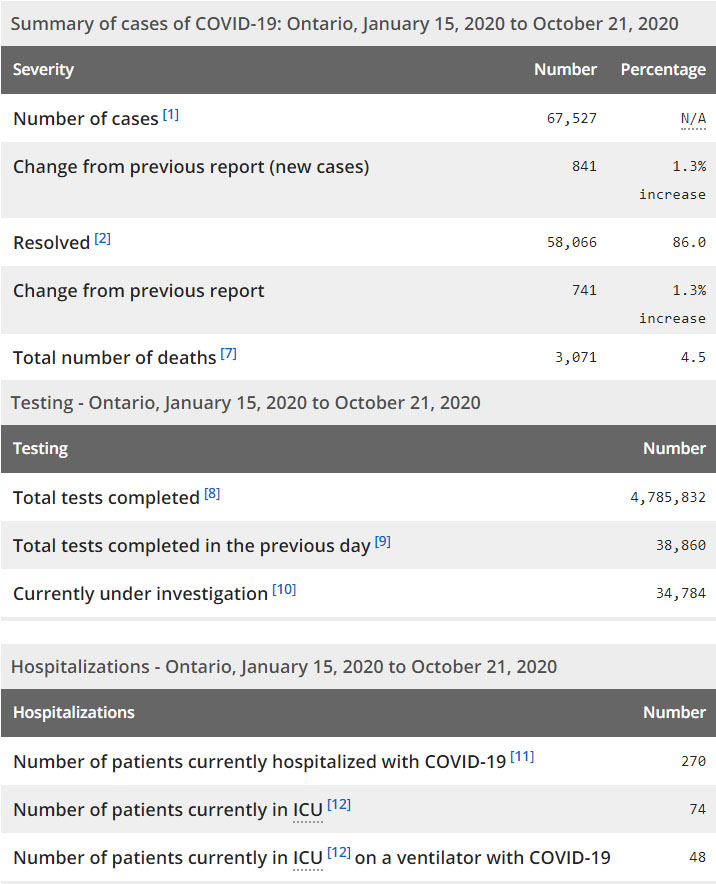 再看看安省方面的详细数据,截止10月21日,安省已对4,785,832例行了新冠病毒检测(检测数较昨天新增38,860),还有34,784处于被调查阶段。确诊总数67,527(较昨天新增841,确诊率仍为2.42%),包括58,066例康复(康复率仍为86%)、3071例死亡(较昨天增加9例,死亡率下降为4.5%)。住院患者270例(增加10);进入ICU患者74例(增加3);IU插呼吸机患者48例(减少1)。