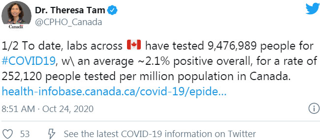 —— 加拿大首席公共卫生官谭咏诗(Theresa Tam)博士在10月24日发布数据称,截止10月24日,加拿大共检测了9,476,989,确诊率为2.1%(世界卫生组织设定的目标是使阳性确诊率保持在5%以下),每100万人口中共有252,120人接受测试。