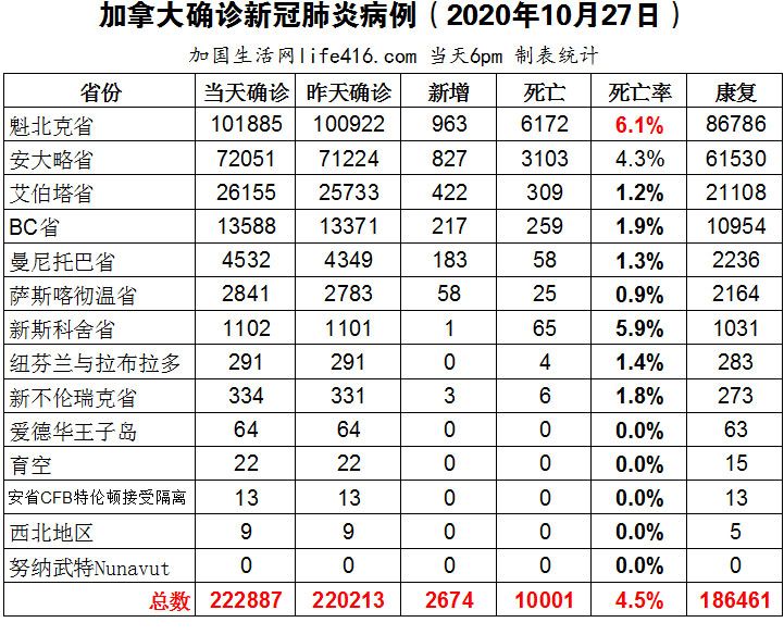 【加国生活网编译报道】截至10月27日下午6点,加拿大确诊新冠病例总数222887(当天新增2674),死亡10001(新增28)。魁省确诊总数101885(当日新增963);安省确诊总数72051(当日新增827);艾省确诊总数26155(当天新增422);BC省确诊总数13588(当天新增217);曼省确诊总数4532(当日新增183);萨省确诊总数2841(当天新增58)。加拿大新冠疫情又达到了一个严峻里程碑,死亡病例超过1万;曼省新增184例确诊病例创该省自疫情以来的最高记录;安省新增827例而检测不到2.4万致使阳性率上升;魁省省长期望能让省民安心地与家人共渡圣诞。加国生活网专门制作了如下统计数据表: