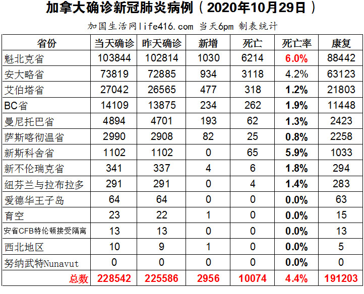 【加国生活网编译报道】截至10月29日下午6点,加拿大确诊新冠病例总数228542(当天新增2956),死亡10074(新增42)。魁省确诊总数103844(当日新增1030);安省确诊总数73819(当日新增934);艾省确诊总数27042(当天新增477);BC省确诊总数14109(当天新增234);曼省确诊总数4894(当日新增193);萨省确诊总数2990(当天新增82)。BC省首席卫生官表示许多新案件与聚会直接相关;艾省从11月2日起将针对18岁以下的新冠症状列表进行修改,将流鼻涕和喉咙痛从症状列表中删除;安省最新新冠疫情曲线显示虽增长放缓,但确诊病例还在继续攀升并会随时急速增长。加国生活网专门制作了如下统计数据表: