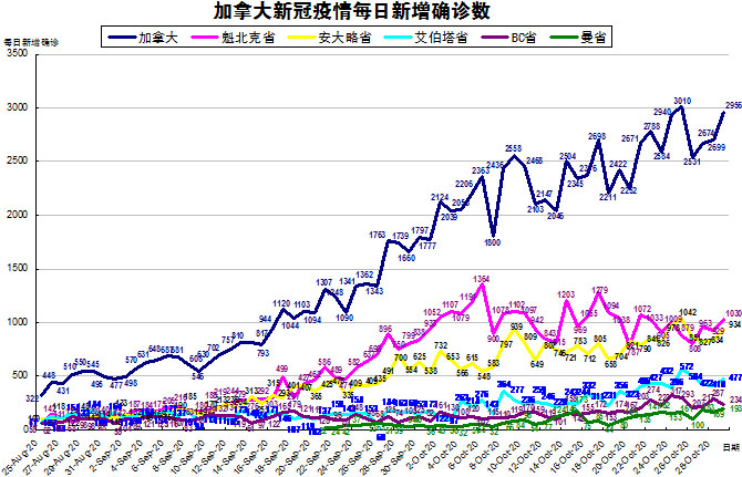 由于加拿大目前的疫情格局已经不再是魁省和安省确诊病例最多的情况了,其他几个省份也渐渐开始加重起来,“第二波”疫情已经到来,所以加国生活网小编统计了从8月25日至10月29日的五个省份的新增确诊数,并制作了如下曲线图,大家可以了解一下加拿大目前新冠疫情的发展趋势。加拿大当日新增2956例,按新增确诊数按省份排列分别是:魁省新增1030、安省新增934、艾省新增477、BC省新增234、曼省新增193、萨省新增82(未超过100,未在下图中体现)。