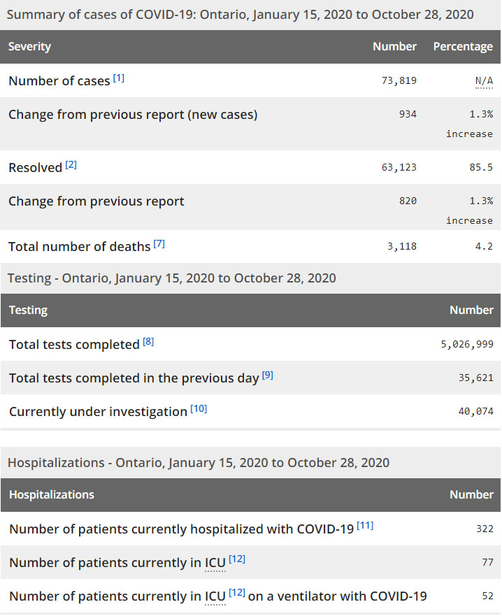 再看看安省方面的详细数据,截止10月28日,安省已对5,026,999例进行了新冠病毒检测(检测数较昨天新增35,621),还有40,074处于被调查阶段。确诊总数73,819(较昨天新增934,确诊率下降为2.62%),包括63,123例康复(康复率仍为85.5%)、3118例死亡(较昨天增加10例,死亡率下降为4.2%)。住院患者322例(增加10);进入ICU患者77例(增加6);IU插呼吸机患者52例(增加1)。