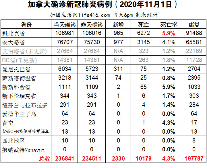 【加国生活网编译报道】截至11月1日下午6点,加拿大新冠确诊病例总数236841(当天新增2330),死亡10179(新增43)。魁省确诊总数106981(当日新增965);安省确诊总数76707(当日新增977);曼省确诊总数6034(当日新增311);萨省确诊总数3218(当天新增74);艾省和BC省逢周末不更新。加拿大新冠确诊率为2.4%;副总理新冠测试呈阴性;艾省传染病专家认为新社交聚会限制15人可能还远远不够,若不采取更多措施,圣诞节前每天可能会出现4千新病例。加国生活网专门制作了如下统计数据表: