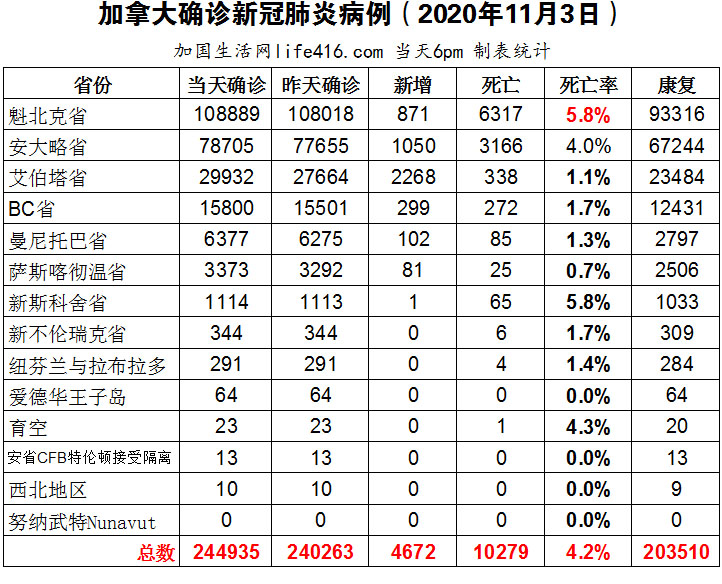 【加国生活网编译报道】截至11月3日下午6点,加拿大新冠确诊病例总数244935(周末新增4672,当天新增2974),死亡10279(新增71)。魁省确诊总数108889(当日新增871);安省确诊总数78705(当日新增1050);艾省确诊总数29932(周末新增2268);BC省确诊总数15800(当天新增299);曼省确诊总数6377(当日新增102);萨省确诊总数3373(当天新增81)。加拿大公共卫生局建议加拿大人选择三层带过滤层的非医用口罩;艾省4天新增2268例确诊病例,平均每天新增567例;安省新增1,050例确诊病例,再创自疫情以来的单日增幅新高;安省将引入一套全新限制分层系统。加国生活网专门制作了如下统计数据表: