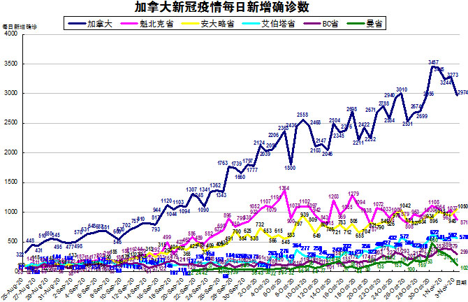 随着周末的结束,一直没有数据BC省终于在昨天提供新数据,而艾省因为数据库维护晚一天更新,也终于在今天发布新数据了,加国生活网小编将当天新增的4672例逐日进行了分解。由于加拿大目前的疫情格局已经不再是魁省和安省确诊病例最多的情况了,其他几个省份也渐渐开始加重起来,“第二波”疫情已经到来,所以加国生活网小编统计了从8月25日至11月3日的五个省份的新增确诊数,并制作了如下曲线图,大家可以了解一下加拿大目前新冠疫情的发展趋势。加拿大当日新增2974例,按新增确诊数按省份排列分别是:安省新增1050、魁省新增871、艾省新增570、BC省新增299、曼省新增102、萨省新增81(未超过100,未在下图中体现)。