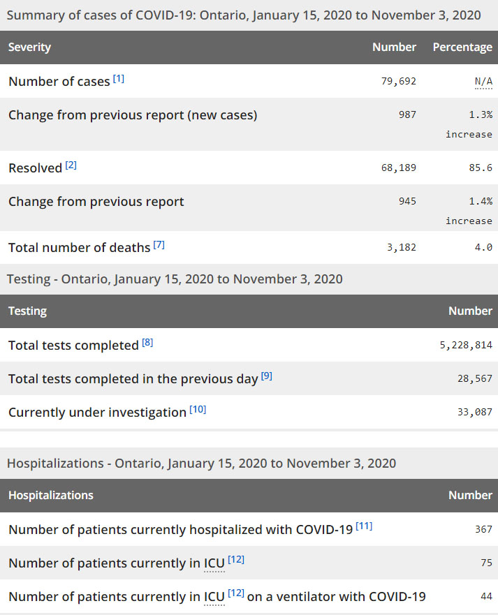 再看看安省方面的详细数据,截止11月3日,安省已对5,228,814例进行了新冠病毒检测(检测数较昨天新增28,567),还有33,087处于被调查阶段。确诊总数79,692(较昨天新增987,确诊率下降为3.46%),包括68,189例康复(康复率上升为85.6%)、3166例死亡(较昨天增加14例,死亡率下降为4.0%)。住院患者367例(增加10);进入ICU患者75例(增加2);IU插呼吸机患者44例(渐少3)。