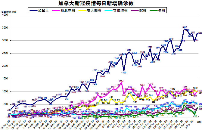由于加拿大目前的疫情格局已经不再是魁省和安省确诊病例最多的情况了,其他几个省份也渐渐开始加重起来,“第二波”疫情已经到来,所以加国生活网小编统计了从8月25日至11月4日的五个省份的新增确诊数,并制作了如下曲线图,大家可以了解一下加拿大目前新冠疫情的发展趋势。加拿大当日新增3283例,按新增确诊数按省份排列分别是:魁省新增1029、安省新增987、艾省新增515、BC省新增335、曼省新增374、萨省新增35(未超过100,未在下图中体现)。