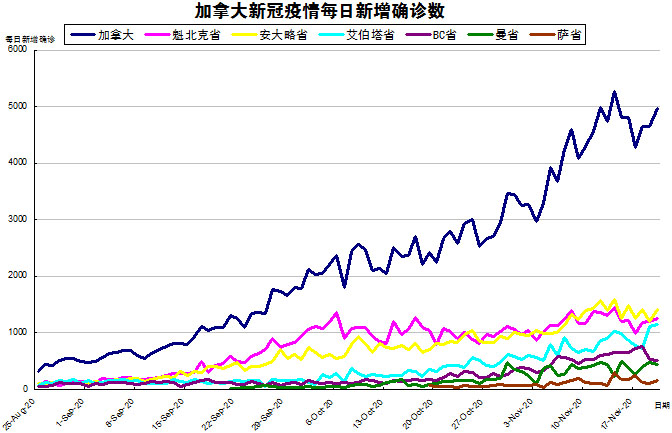 由于加拿大目前的疫情格局已经不再是魁省和安省确诊病例最多的情况了,其他几个省份也渐渐开始加重起来,“第二波”疫情已经到来,所以加国生活网小编统计了从8月25日至11月20日的五个省份的新增确诊数,并制作了如下曲线图,大家可以了解一下加拿大目前新冠疫情的发展趋势。加拿大当日新增4966例,按新增确诊数由多至少的排列分别是:安省新增1418、魁省新增1259、艾省新增1155、BC省新增514、曼省新增437、萨省新增153。(PS:从今天起图表就不标数值了,好让大家能清晰地看到疫情发展的趋势,比如艾省目前有赶超安省和魁省的趋势。)