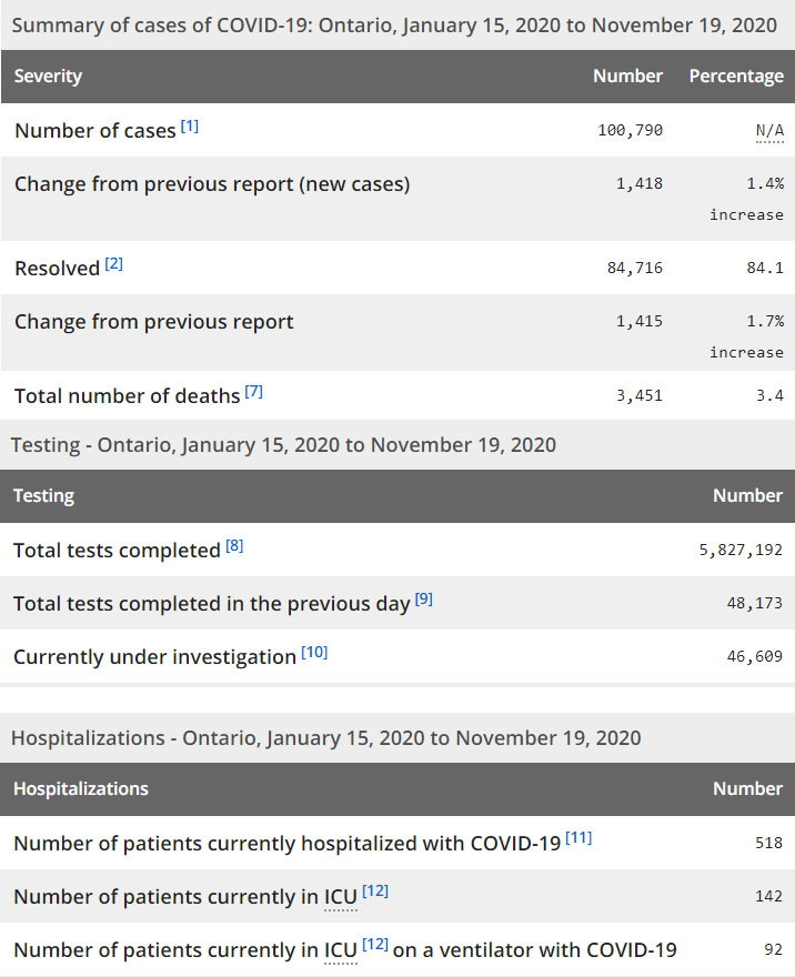 再看看安省方面的详细数据,截止11月19日,安省已对5,827,192例进行了新冠病毒检测(检测数较昨天新增48,173),还有46,609处于被调查阶段。确诊总数100,790(较昨天新增1418,确诊率上升为2.94%),包括84,716例康复(康复率上升为84.1%)、3451例死亡(较昨天增加8例,死亡率下降为3.4%)。住院患者518例(减少8);进入ICU患者142例(减少4);IU插呼吸机患者92例(增加4)。