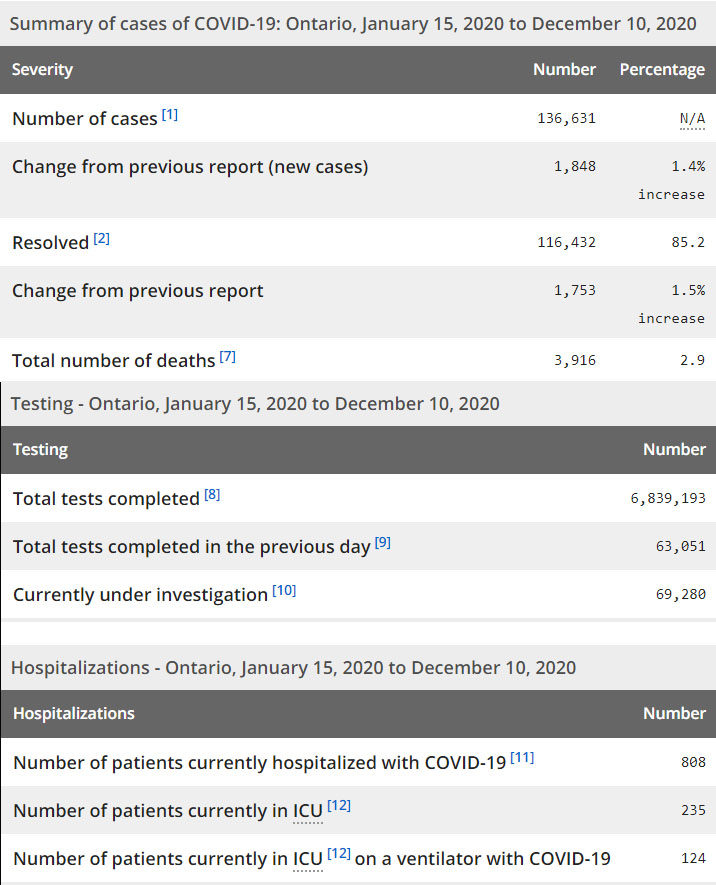 再看看安省方面的详细数据,截止12月10日,安省已对6,839,193例进行了新冠病毒检测(检测数较昨天新增63,051),还有69,280处于被调查阶段。确诊总数136,631(较昨天新增1848,确诊率下降至2.93%),包括116,432例康复(康复率上升为85.2%)、3916例死亡(较昨天增加45例,死亡率仍为2.9%)。住院患者808例(减少21);进入ICU患者235例(增加7);IU插呼吸机患者124例(减少8)。