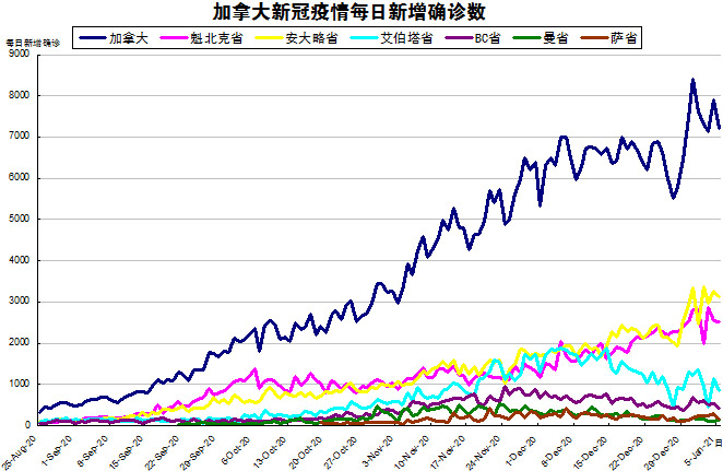 由于加拿大目前的疫情格局已经不再是“第一波”疫情时魁省和安省确诊病例最多的情况了,其他几个省份也渐渐开始加重起来,“第二波”疫情正在进行中,所以加国生活网小编统计了从2020年8月25日至2021年1月5日的五个省份的新增确诊数,并制作了如下曲线图,大家可以了解一下加拿大目前新冠疫情的发展趋势。加拿大当日新增7222例,按新增确诊数由多至少的排列分别是:安省新增3128、魁省新增2508、艾省新增843、BC省新增428、萨省新增153、曼省新增130。