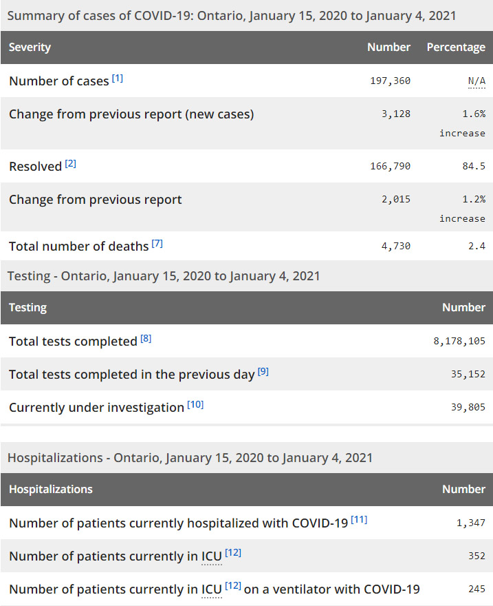 再看看安省方面的详细数据,截止1月4日,安省已对8,178,105例进行了新冠病毒检测(检测数较昨天新增35,152),还有39,805处于被调查阶段。确诊总数197,360(较昨天新增3128,确诊率上升至8.9%),包括166,790例康复(康复率下降至84.5%)、4730例死亡(增加51例,死亡率仍为2.4%)。住院患者1347例(增加157);进入ICU患者352例(增加19);IU插呼吸机患者245例(增加51)。