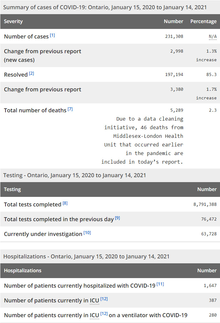 再看看安省方面的详细数据,截止1月14日,安省已对8,791,388例进行了新冠病毒检测(检测数较昨天新增76,472),还有63,728处于被调查阶段。确诊总数231,308(较昨天新增2998,确诊率下降至3.92%),包括197,194例康复(康复率上升至85.3%)、5289例死亡(增加100例,死亡率仍为2.3%)。住院患者1647例(减少10);进入ICU患者387例(减少1);IU插呼吸机患者280例(未变)。