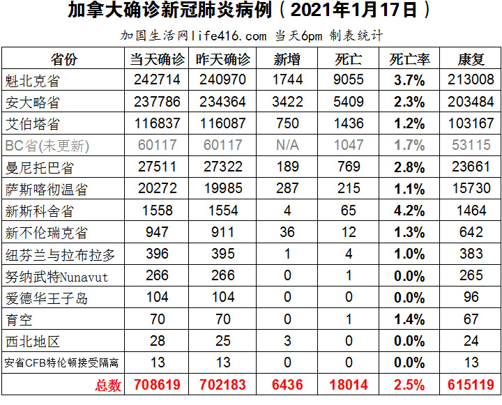 【加国生活网编译报道】截至2021年1月17日下午6点,加拿大新冠确诊病例总数为708619(新增6436),死亡18014(新增149)。魁省确诊总数242714(新增1744);安省确诊总数237786(新增3422);艾省确诊总数116837(新增750);BC省逢周末不更新;曼省确诊总数27511(新增189);萨省确诊总数20272(新增287)。加拿大新冠死亡总数超1万8;多伦多当天新增1035例确诊病例,再创自疫情以来最高纪录;安省希望在7月底或8月初为所有省民接种疫苗。加国生活网专门制作了如下统计数据表: