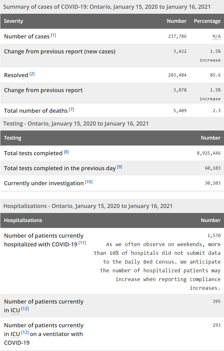 再看看安省方面的详细数据,截止1月16日,安省已对8,925,446例进行了新冠病毒检测(检测数较昨天新增60,183),还有30,103处于被调查阶段。确诊总数237,786(较昨天新增3422,确诊率上升至5.69%),包括203,484例康复(康复率上升至85.6%)、5409例死亡(增加69例,死亡率仍为2.3%)。住院患者1570例(减少62,有近10%的医院没有提交最新数据);进入ICU患者395例(减少2);IU插呼吸机患者293例(增加12)。