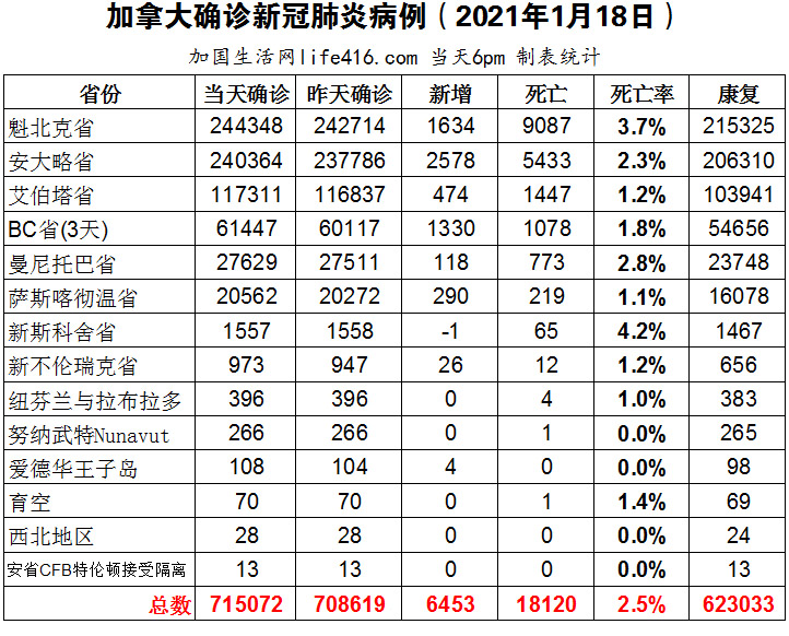 【加国生活网编译报道】截至2021年1月18日下午6点,加拿大新冠确诊病例总数为715072(3天新增6453,当天新增5424),死亡18120(3天新增106)。魁省确诊总数244348(新增1634);安省确诊总数240364(新增2578);艾省确诊总数117311(新增474);BC省确诊总数61447(新3天新增1330,当天新增301);曼省确诊总数27629(新增118);萨省确诊总数20562(新增290)。BC省和艾省疫情均有所缓解,艾省将从1月18日起开始放宽一些公共卫生限制;安省首席卫生官表示,若想放宽限制每天新增病例不能超过1000例。加国生活网专门制作了如下统计数据表: