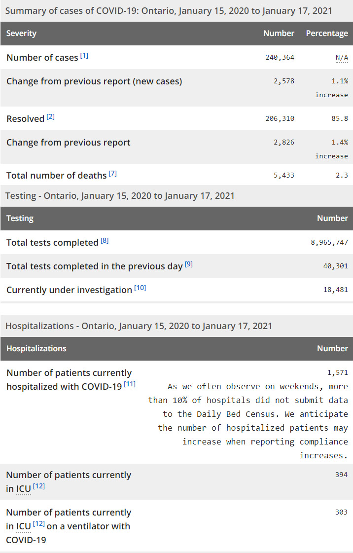 再看看安省方面的详细数据,截止1月17日,安省已对8,965,747例进行了新冠病毒检测(检测数较昨天新增40,301),还有18,481处于被调查阶段。确诊总数240,364(较昨天新增2578,确诊率上升至6.4%),包括206,310例康复(康复率上升至85.8%)、5433例死亡(增加24例,死亡率仍为2.3%)。住院患者1571例(增加1,有近10%的医院没有提交最新数据);进入ICU患者394例(减少1);IU插呼吸机患者303例(增加10)。