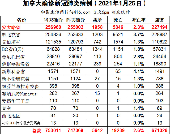 【加国生活网编译报道】截至2021年1月25日下午6点,加拿大新冠确诊病例总数为753011(3天新增5642,当天新增4644),死亡19239(3天新增145)。安省确诊总数256960(新增1958);魁省确诊总数254836(新增1203);艾省确诊总数121535(新增742);BC省确诊总数64828(3天新增1344,当天新增346);曼省确诊总数28810(新增113);萨省确诊总数22416(新增239)。加拿大正在考虑进一步限制进入加拿大的国际旅行;BC省首席卫生官警告称虽然目前BC省平均每天确诊人数稳定在500例左右,但这个数字仍很高;安省当天新增1958例确诊病例,近一个月来首次低于2千例。加国生活网专门制作了如下统计数据表: