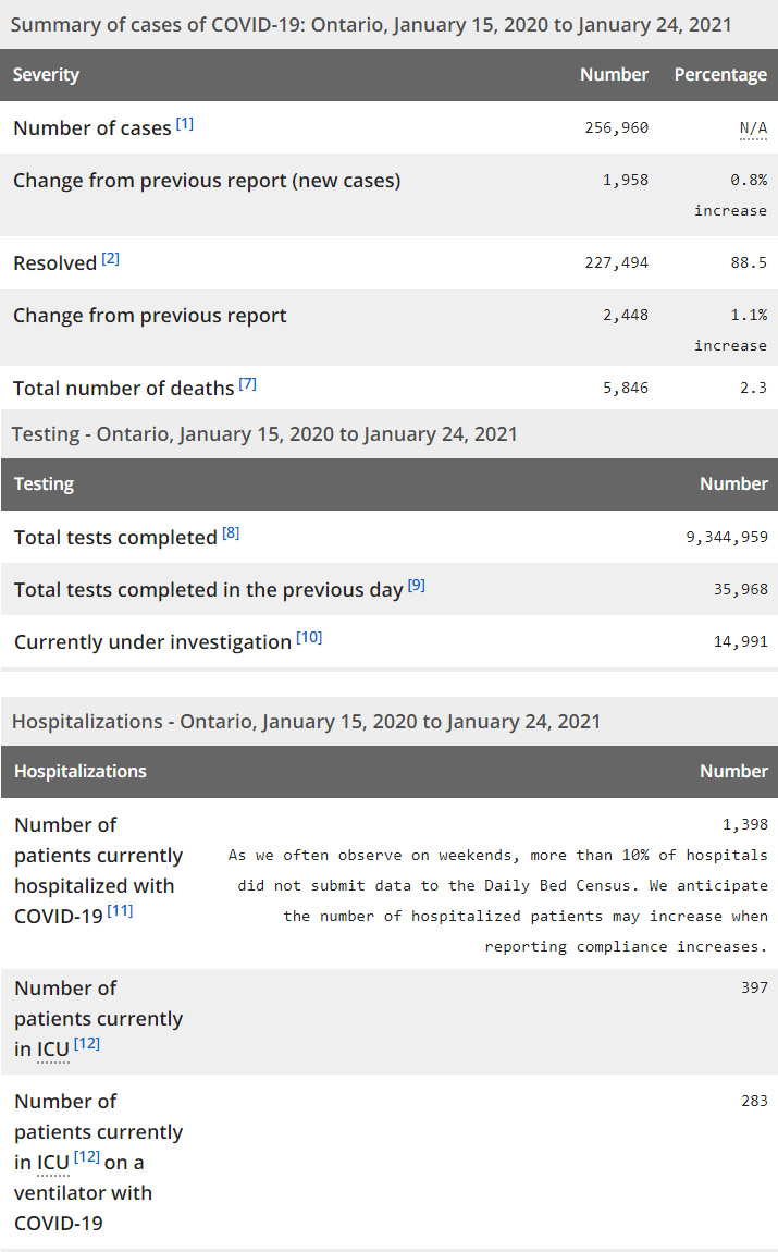 再看看安省方面的详细数据,截止1月24日,安省已对9,344,959例进行了新冠病毒检测(检测数较昨天新增35,968),还有14,991处于被调查阶段。确诊总数256,960(较昨天新增1,958,确诊率上升至5.44%),包括227,494例康复(康复率上升至88.5%)、5846例死亡(增加43例,死亡率仍为2.3%)。住院患者1398例(减少38,有10%数据未提交);进入ICU患者397例(增加5);IU插呼吸机患者283例(减少18)。