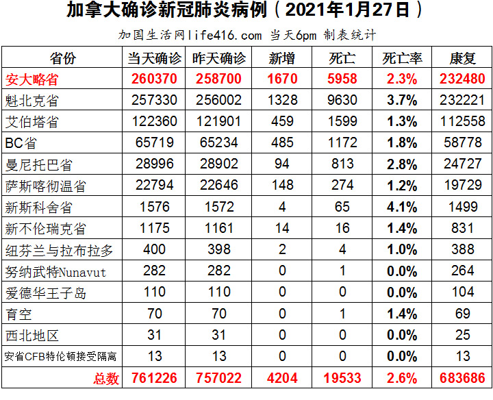 【加国生活网编译报道】截至2021年1月27日下午6点,加拿大新冠确诊病例总数为761226(新增4204),死亡19533(新增130)。安省确诊总数260370(新增1670);魁省确诊总数257330(新增1328);艾省确诊总数122360(新增459);BC省确诊总数65719(新增485);曼省确诊总数28996(新增94);萨省确诊总数22794(新增148)。传染病专家们j坚持认为,新冠疫苗保护益处远胜于任何最小风险;安省当天新增1670例,不仅连续第三天低于2千例,而且创自去年11月26日以来的最低数字;多伦多卫生官警告称,当天虽新增450例,但仍需警惕变异新冠病毒。加国生活网专门制作了如下统计数据表: