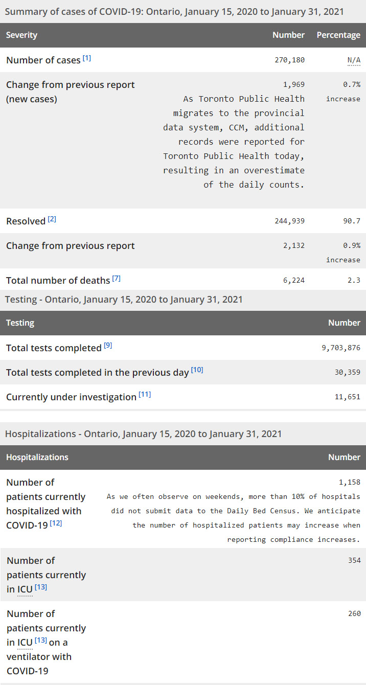 再看看安省方面的详细数据,截止1月31日,安省已对9,703,876例进行了新冠病毒检测(检测数较昨天新增30,359),还有11,651处于被调查阶段。确诊总数270,180(较昨天新增1,969,确诊率上升至6.49%,由多伦多公共卫生部向省级数据系统CCM迁移数据,今天还报告了多伦多公共卫生部的其他记录,导致当天新增数据出现高估的情况),包括244,939例康复(康复率上升至90.7%)、6,224例死亡(增加36例,死亡率仍为2.3%)。住院患者1158例(减少1,超过10%医院周末没有提交数据);进入ICU患者354例(减少2);IU插呼吸机患者260例(增加8)。