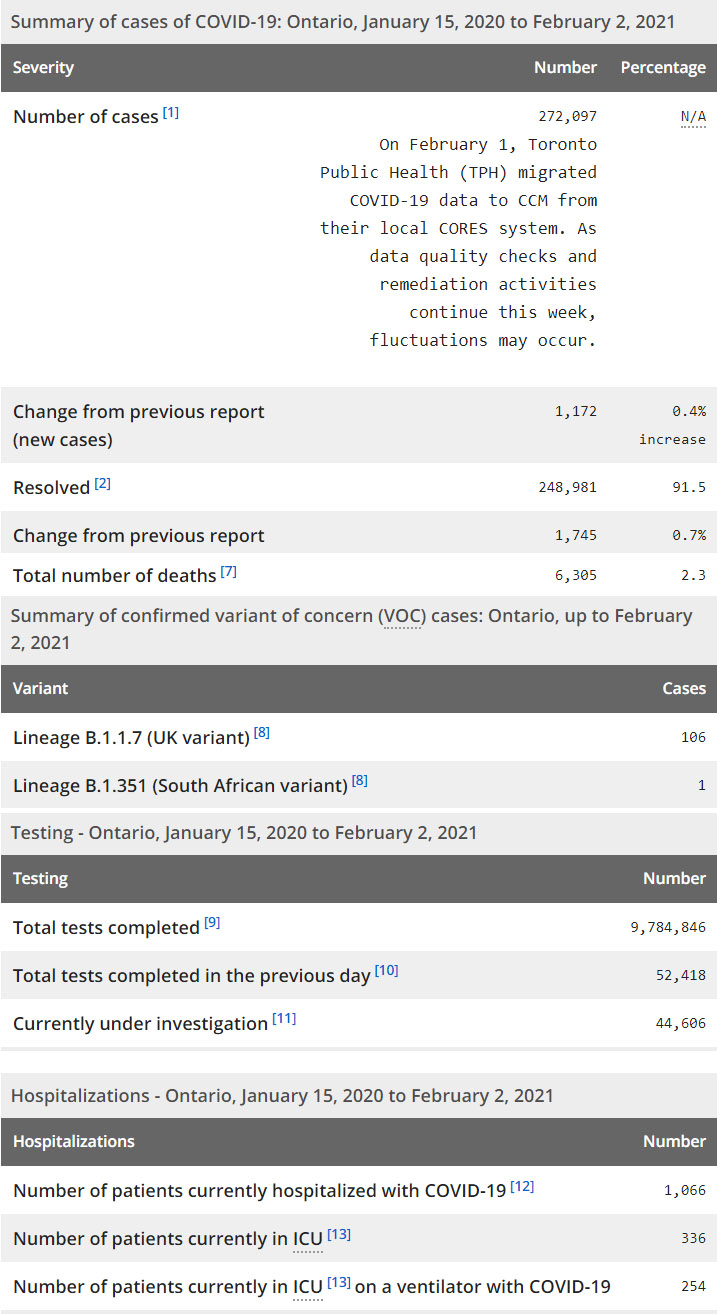 再看看安省方面的详细数据,截止2月2日,安省已对9,784,846例进行了新冠病毒检测(检测数较昨天新增52,418),还有44,606处于被调查阶段。确诊总数272,097(较昨天新增1172,多伦多公共卫生(TPH)在2月1日将数据从其本地CORES系统迁移到了安省卫生部CCM系统。 随着本周数据质量检查和补救工作的继续,预计接下来几天的病例数会有所波动。),包括248,981例康复(康复率上升至91.5%)、6,305例死亡(增加67例,死亡率仍为2.3%)。住院患者1066例(减少126);进入ICU患者336例(减少5);IU插呼吸机患者254例(增加1)。