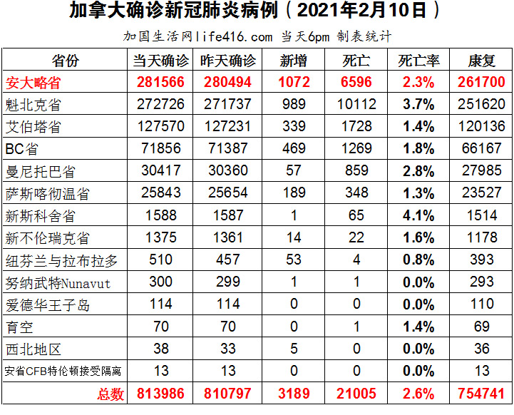 【加国生活网编译报道】截至2021年2月10日下午6点,加拿大新冠确诊病例总数为813986(新增3189),死亡21005(新增95例)。安省确诊总数281566(新增1072);魁省确诊总数272726(新增989);艾省确诊总数127570(新增339);BC省确诊总数71856(新增469);曼省确诊总数30417(新增57);萨省确诊总数25843(新增189)。纽芬兰和拉布拉多省当天爆增53例创自疫情以来最高记录,加拿大首席卫生官警告各省变异病毒会使疫情逆转;安省当天新增1,072例确诊病例,省府已经对95%的长期护理院居民进行了疫苗接种。加国生活网专门制作了如下统计数据表: