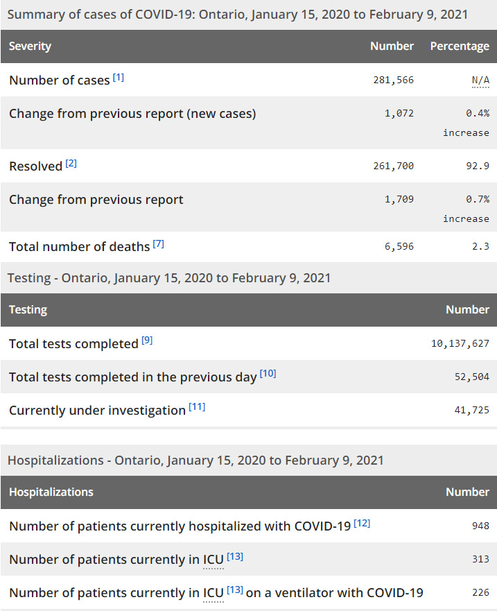 再看看安省方面的详细数据,截止2月9日,安省已对10,137,627例进行了新冠病毒检测(检测数较昨天新增52,504),还有41,725处于被调查阶段。确诊总数281,566(较昨天新增1072,阳性率下降为2.04%),包括261,700例康复(康复率上升至92.9%)、6,596例死亡(增加41例,死亡率仍为2.3%)。住院患者948例(增加39);进入ICU患者313例(减少5);IU插呼吸机患者226例(增加3)。