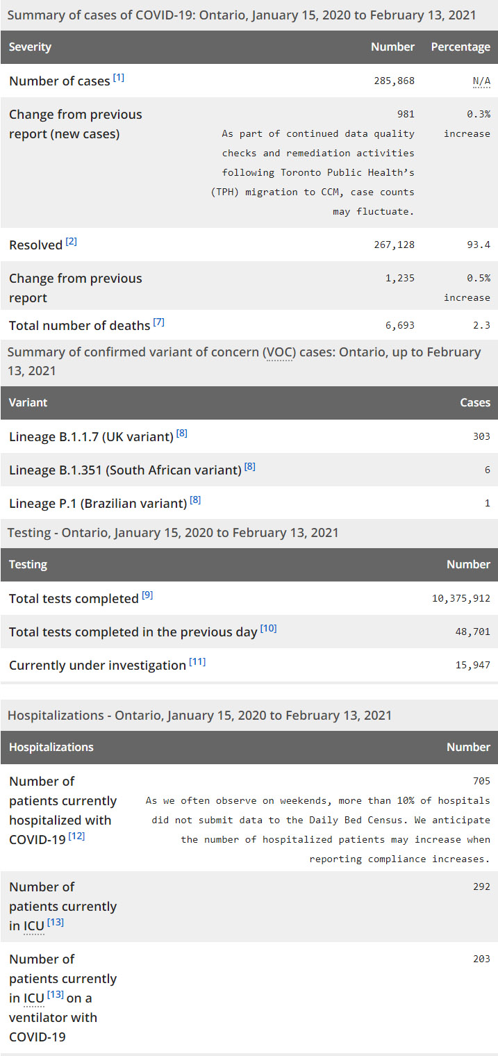 再看看安省方面的详细数据,截止2月13日,安省已对10,375,912例进行了新冠病毒检测(检测数较昨天新增48,701),还有15,947处于被调查阶段。确诊总数285,868(较昨天新增981,阳性率下降为2.01%),包括267,128例康复(康复率仍为93.3%)、6,693例死亡(增加42例,死亡率仍为2.3%)。住院患者705例(减少81,10%医院没有提交数据);进入ICU患者292例(增加5);IU插呼吸机患者203例(未变)。
