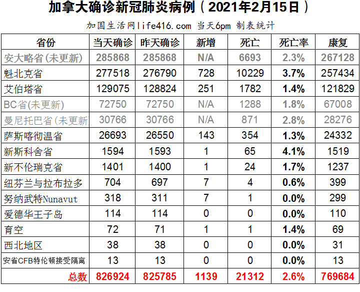 【加国生活网编译报道】截至2021年2月15日下午6点,加拿大新冠确诊病例总数为826924(新增1139),死亡21312(新增19例)。因当天是“家庭日”长周末,安省未更新;魁省确诊总数277518(新增728);艾省确诊总数129075(新增251);BC省未更新;曼省未更新;萨省确诊总数26693(新增143)。安省密西沙加市的一幢公寓内发现了5例B1351南非变异病毒病例,皮尔区卫生部表示对楼内居民进行逐层的门到门新冠测试;加拿大国家免疫咨询委员会NACI建议在进行新冠疫苗接种之前或之后不宜使用止痛药或退热药。加国生活网专门制作了如下统计数据表: