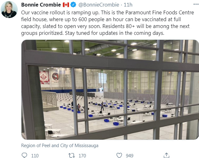 密西沙加市市长Bonnie Crombie在Twitter上分享了一张美食中心的照片,那里已经完全变成了密市的五个疫苗接种地点之一。Bonnie Crombie表示,该地点每小时可接种600人,并将很快开放。密市计划第一阶段预计接种80岁以上的成年人、退休之家和其他集体护理场所的居民和护理人员、高度优先的医护人员、所有土著社区成年人;第二阶段定于三月开始,将增加更多的疫苗接种地点,包括市政运行地点、医院、流动疫苗接种地点、药房、诊所、社区运营的保健中心和原住民保健中心等。