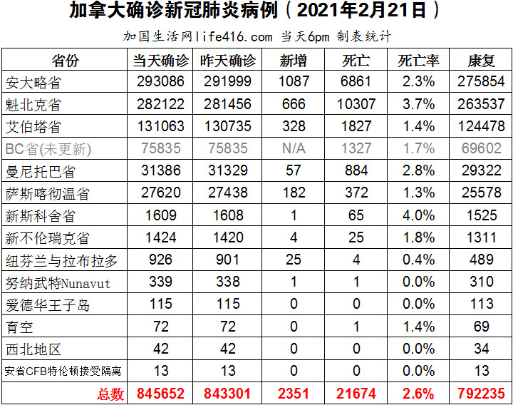 【加国生活网编译报道】截至2021年2月21日下午6点,加拿大新冠确诊病例总数为845652(新增2351),死亡21674(新增44)。安省确诊总数293086(新增1087);魁省确诊总数282122(新增666);艾省确诊总数131063(新增328);BC省逢周末不更新;曼省确诊总数31386(新增57);萨省确诊总数27620(新增182)。魁省新增666例确诊病例,创五个月以来的最低单日确诊病例。鉴于变异病毒可能带来的风险,魁省越来越多的学校实施了全面停课;安省医生认为重新开放是“短视”举措,因为随着确诊病例不断增加以及变异病毒病例不断增加,安省即将迎来“第三波”疫情。加国生活网专门制作了如下统计数据表: