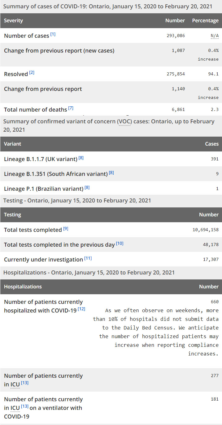 再看看安省方面的详细数据,截止2月20日,安省已对10,694,158例进行了新冠病毒检测(检测数较昨天新增48,178),还有17,307处于被调查阶段。确诊总数293,086(当天新增1087,阳性率上升为2.26%),包括275,854例康复(康复率仍为94.1%)、6,861例死亡(增加41例,死亡率仍为2.3%)。住院患者660例(减少39,有10%医院未提交数据);进入ICU患者277例(增加14);IU插呼吸机患者181例(未变)。