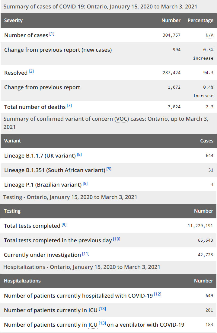 再看看安省方面的详细数据,截止3月3日,安省已对11,229,191例进行了新冠病毒检测(检测数较昨天新增65,643),还有42,723处于被调查阶段。确诊总数304,757(当天新增994,阳性率下降至1.51%),包括287,424例康复(康复率上升为94.3%)、7,024例死亡(增加10例,死亡率仍为2.3%)。住院患者649例(减少19);进入ICU患者281例(增加7);IU插呼吸机患者183例(减少6)。