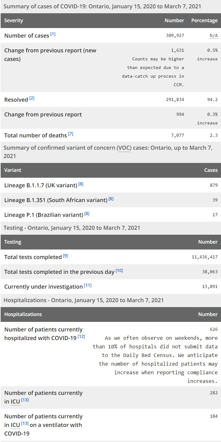再看看安省方面的详细数据,截止3月7日,安省已对11,436,417例进行了新冠病毒检测(检测数较昨天新增38,063),还有13,891处于被调查阶段。确诊总数309,927(当天新增1631,阳性率上升至4.29%。受CCM中的“数据追查程序”影响,计数可能比预期的高),包括291,834例康复(康复率下降至94.2%)、7,077例死亡(增加10例,死亡率仍为2.3%)。住院患者626例(增加20,有10%医院没有更新数据);进入ICU患者282例(增加9);IU插呼吸机患者184例(增加5)。