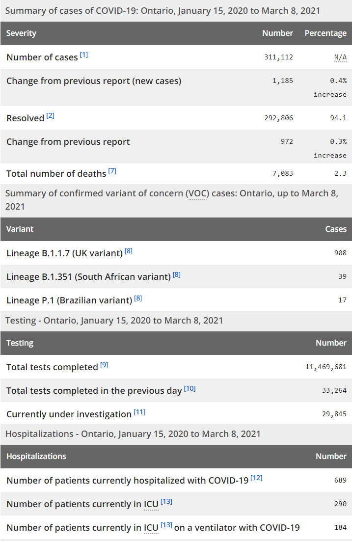 再看看安省方面的详细数据,截止3月8日,安省已对11,469,681例进行了新冠病毒检测(检测数较昨天新增33,264),还有29,845处于被调查阶段。确诊总数311,112(当天新增1185,阳性率下降至3.56%),包括292,806例康复(康复率下降至94.1%)、7,083例死亡(增加6例,死亡率仍为2.3%)。住院患者689例(增加63);进入ICU患者290例(增加8);IU插呼吸机患者184例(未变)。