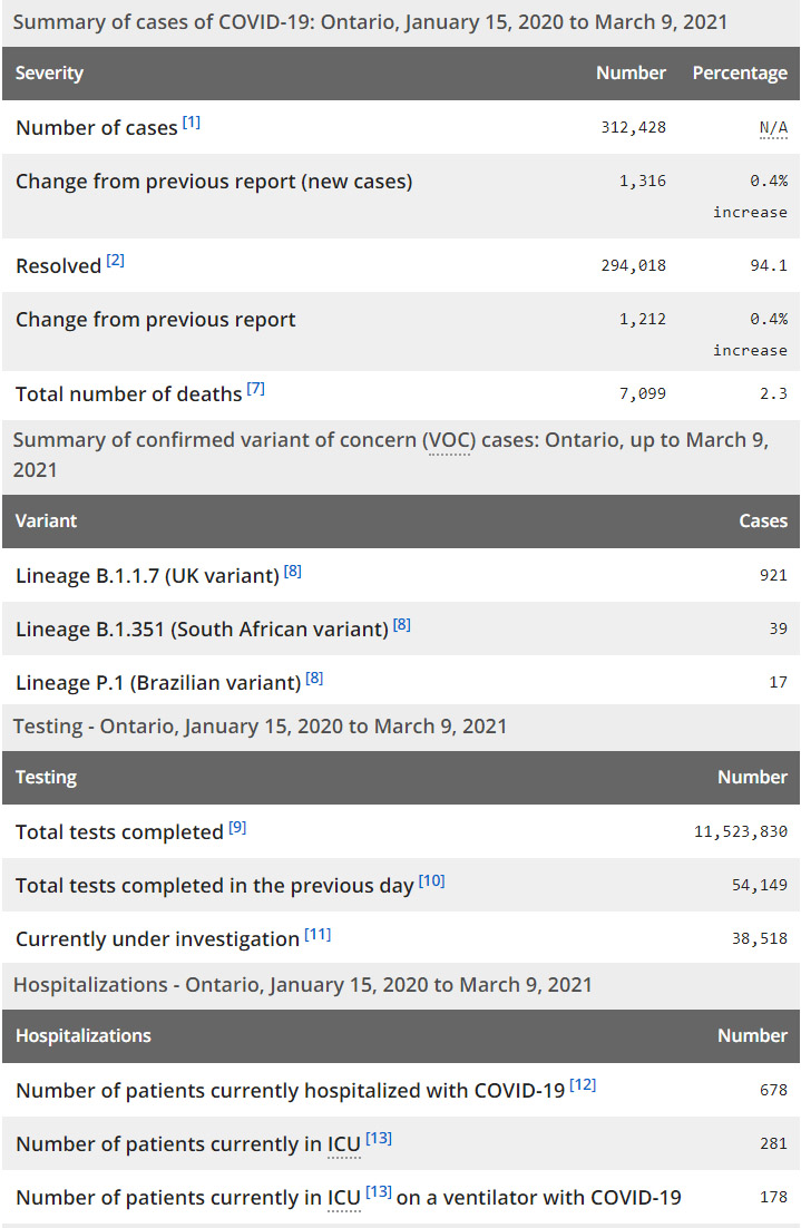 再看看安省方面的详细数据,截止3月9日,安省已对11,523,830例进行了新冠病毒检测(检测数较昨天新增54,149),还有38,518处于被调查阶段。确诊总数312,428(当天新增1316,阳性率下降至2.43%),包括294,018例康复(康复率仍为94.1%)、7,099例死亡(增加16例,死亡率仍为2.3%)。住院患者678例(减少11);进入ICU患者281例(减少9);IU插呼吸机患者178例(减少6)。