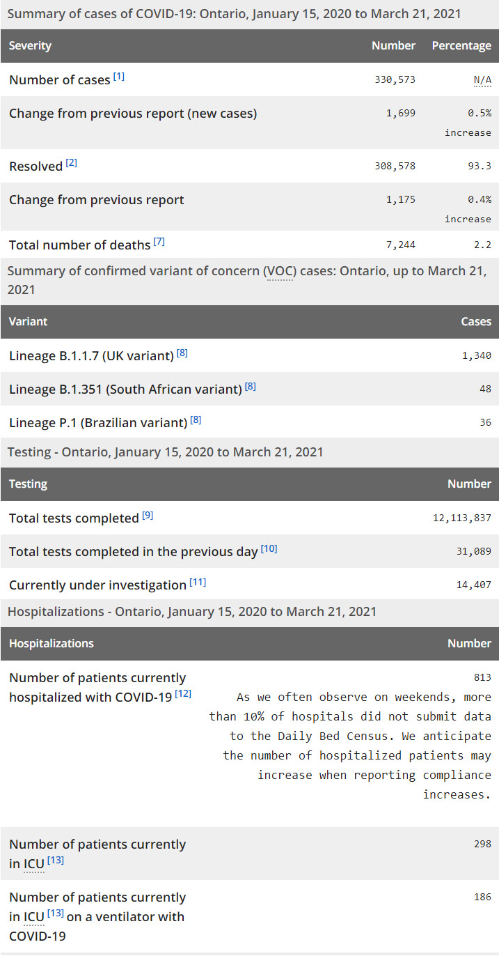 再看看安省方面的详细数据,截止3月21日,安省已对12,113,837例进行了新冠病毒检测(检测数较昨天新增31,089),还有14,407处于被调查阶段。确诊总数330,573(当天新增1699,阳性率上升至5.46%),包括308,578例康复(康复率下降为93.3%)、7,244例死亡(增加3例,死亡率仍为2.2%)。住院患者813例(减少53,10%医院未提交数据);进入ICU患者298例(减少7);IU插呼吸机患者186例(未变)。