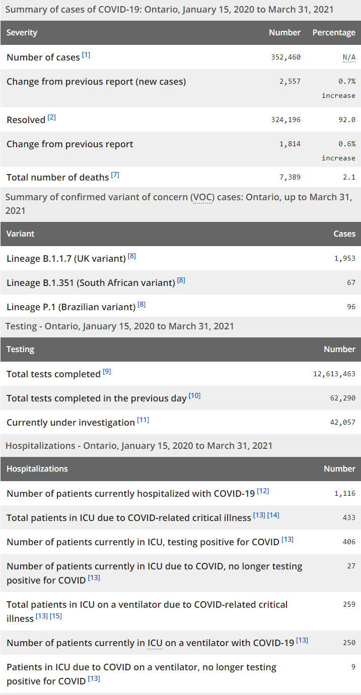再看看安省方面的详细数据,截止3月31日,安省已对12,613,463例进行了新冠病毒检测(检测数较昨天新增62,290),还有42,057处于被调查阶段。确诊总数352,460(当天新增2557,阳性率下降至4.10%),包括324,196例康复(康复率下降为92.0%)、7,389例死亡(增加23例,死亡率仍为2.1%)。住院患者1116例(增加5);进入ICU患者433例(增加37);IU插呼吸机患者250例(减少2)。