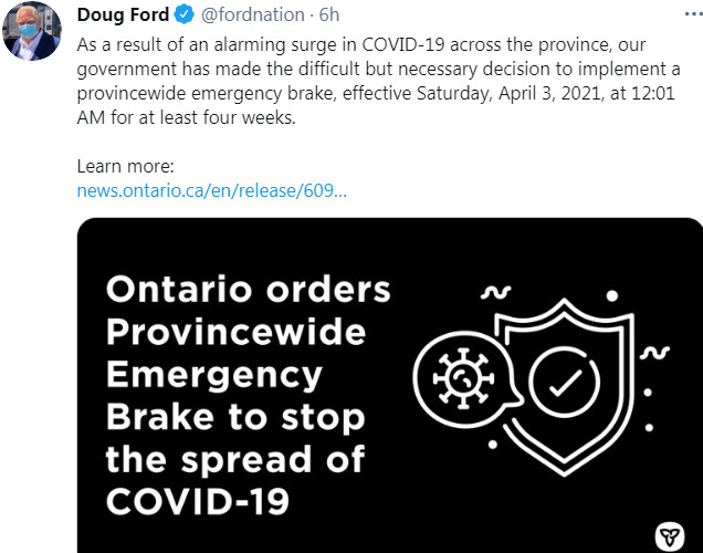 安省政府在4月1日宣布将从4月3日凌晨12:01起实施全省范围的“紧急刹车式”的封锁措施(第三次全省封锁),并将实施至少四个星期。安省省长福特说:“我们正面临严重的第三波疫情,需要采取严厉的措施来遏制新冠病毒的迅速传播,特别是令人关注的变异病毒。我知道对全省许多省民来说,紧急刹车是困难的,但我们必须努力防止更多的人被感染并医院系统被压倒,疫苗接种量正在稳步增加,我鼓励每个有资格进行疫苗接种的人去接种疫苗,这是我们抵抗这种致命病毒的最佳保护。”