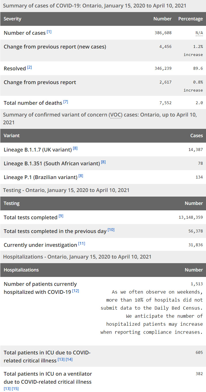再看看安省方面的详细数据,截止4月10日,安省已对13,148,359例进行了新冠病毒检测(检测数较昨天新增56,378),还有31,836处于被调查阶段。确诊总数386,608(当天新增4456,阳性率上升至7.9%),包括346,239例康复(康复率下降为89.6%)、7,552例死亡(增加21例,死亡率仍为2.0%)。住院患者1513例(减少11,有10%医院没有更新);进入ICU患者605例(增加51);IU插呼吸机患者382例(减少2)。