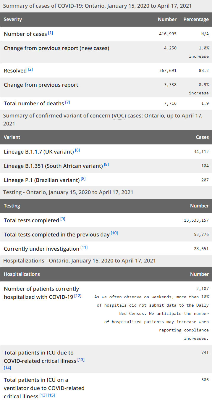再看看安省方面的详细数据,截止4月17日,安省已对13,533,157例进行了新冠病毒检测(检测数较昨天新增53,776),还有28,651处于被调查阶段。确诊总数416,995(当天新增4250,阳性率上升至7.90%),包括367,691例康复(康复率下降为88.2%)、7,716例死亡(增加18例,死亡率仍为1.9%)。住院患者2107例(增加42,有10%医院未提交数据);进入ICU患者741例(增加15);IU插呼吸机患者506例(增加5)。